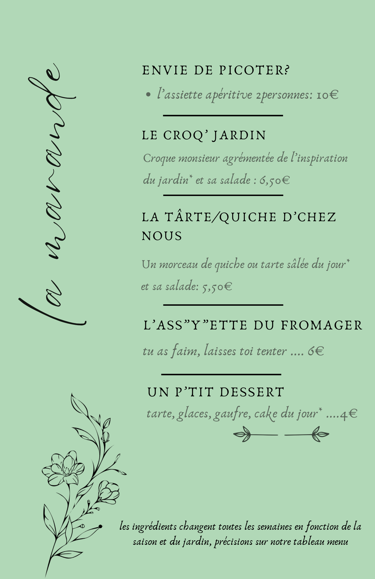 Retrouvez à la carte : assiettes gourmandes, planches à partager, tartes, quiches et douceurs sucrées, selon les saisons et nos envies du moment.